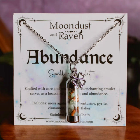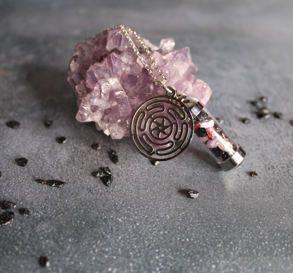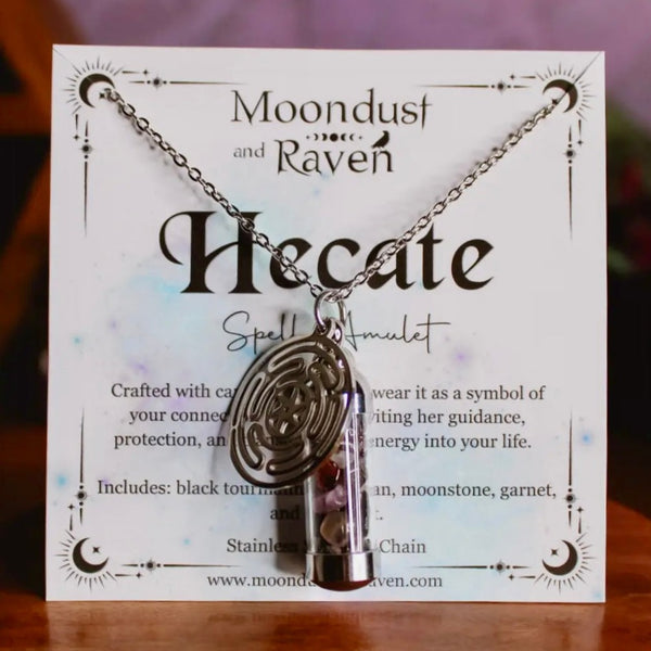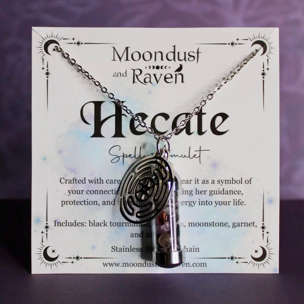 Our Hecate Spell Jar Amulet Necklace contains a powerful blend of black tourmaline, obsidian, moonstone, garnet, and amethyst, each chosen for their connection to Hecate. It is accompanied by a stainless steel Hecate wheel charm.