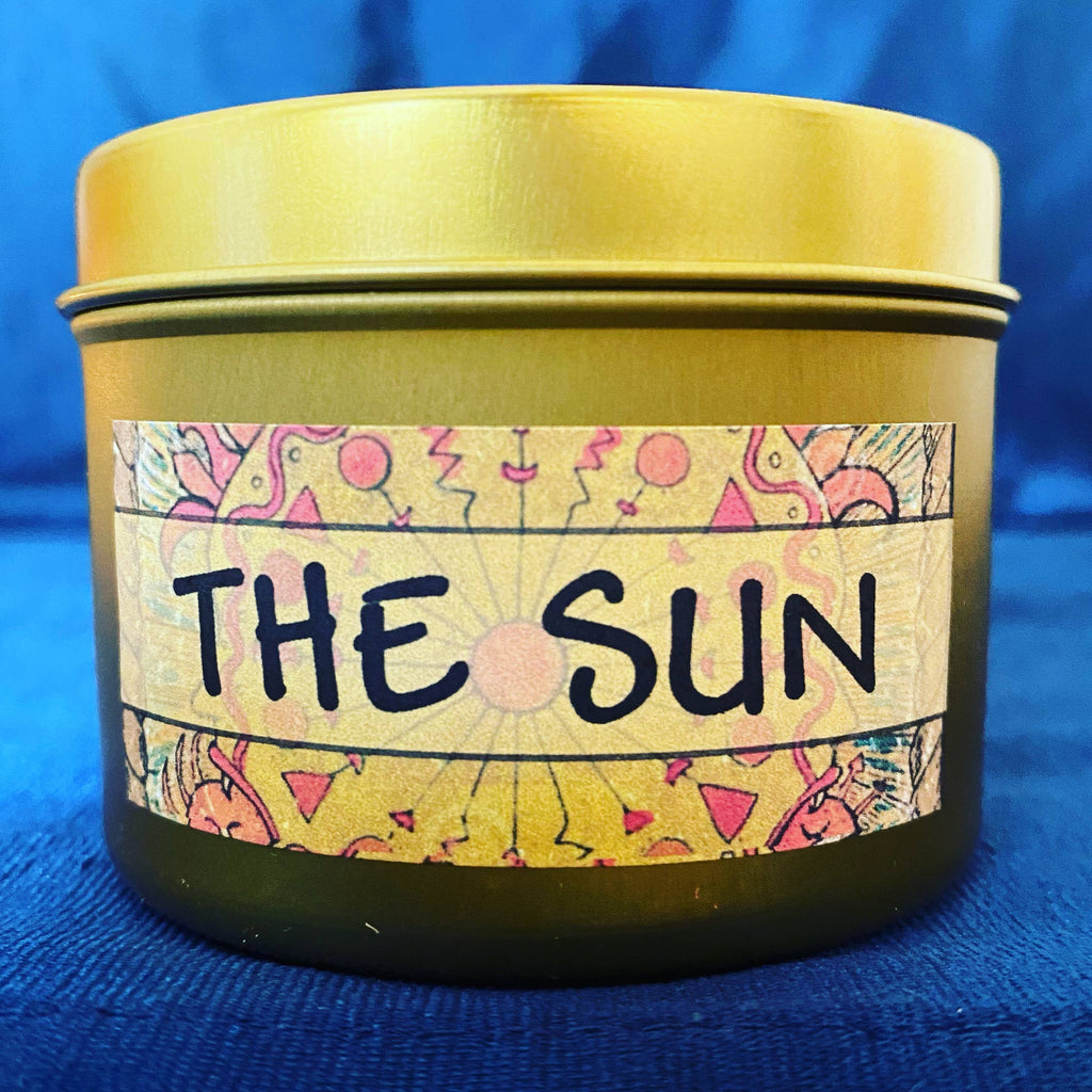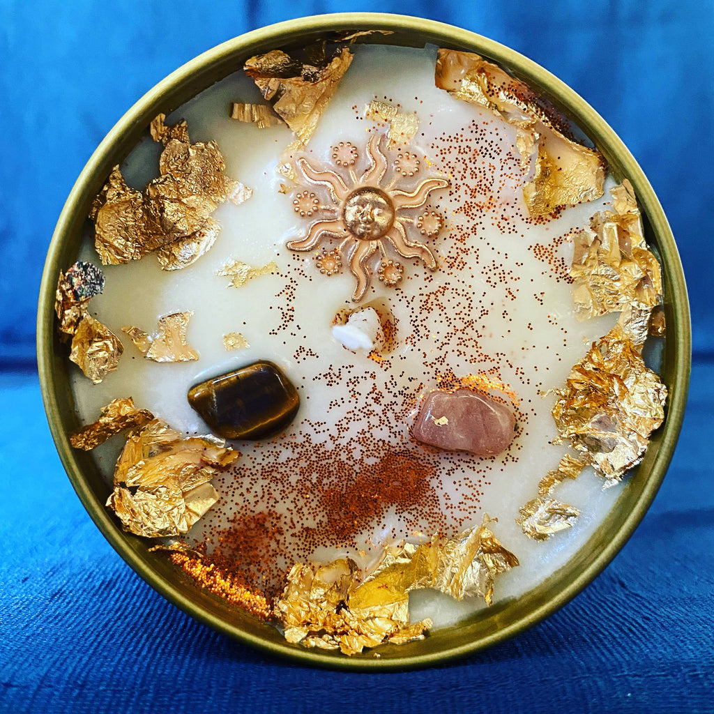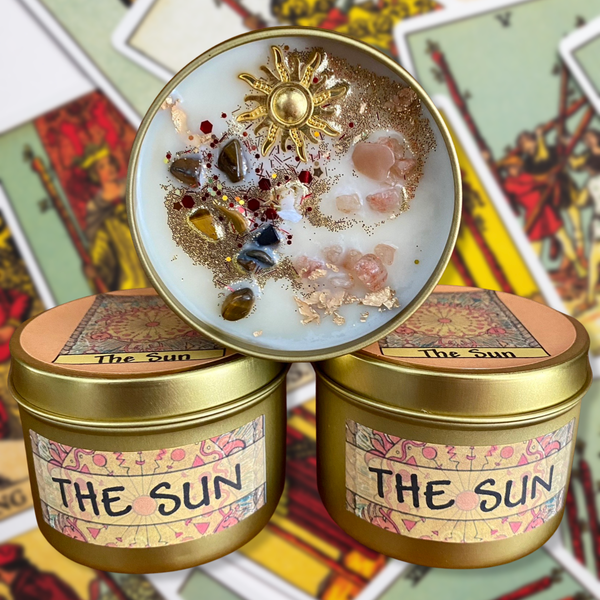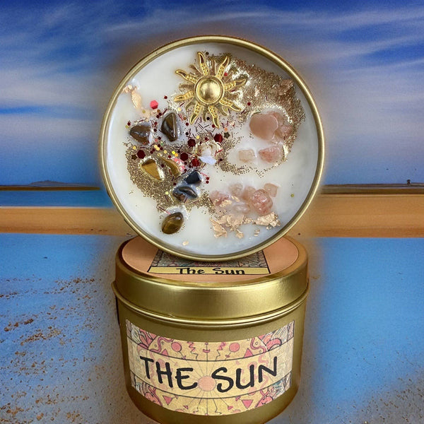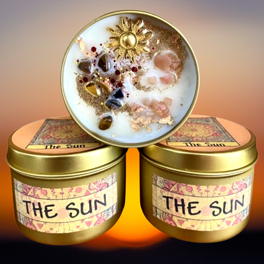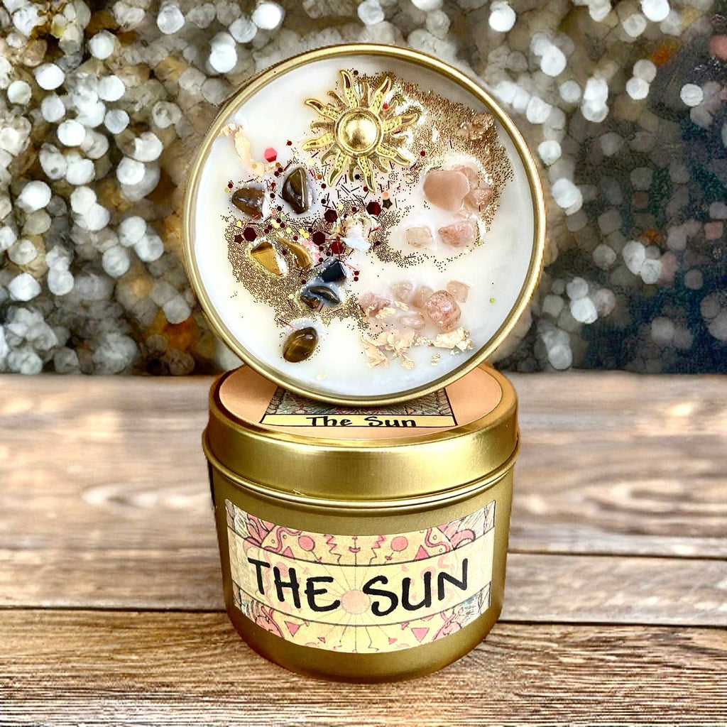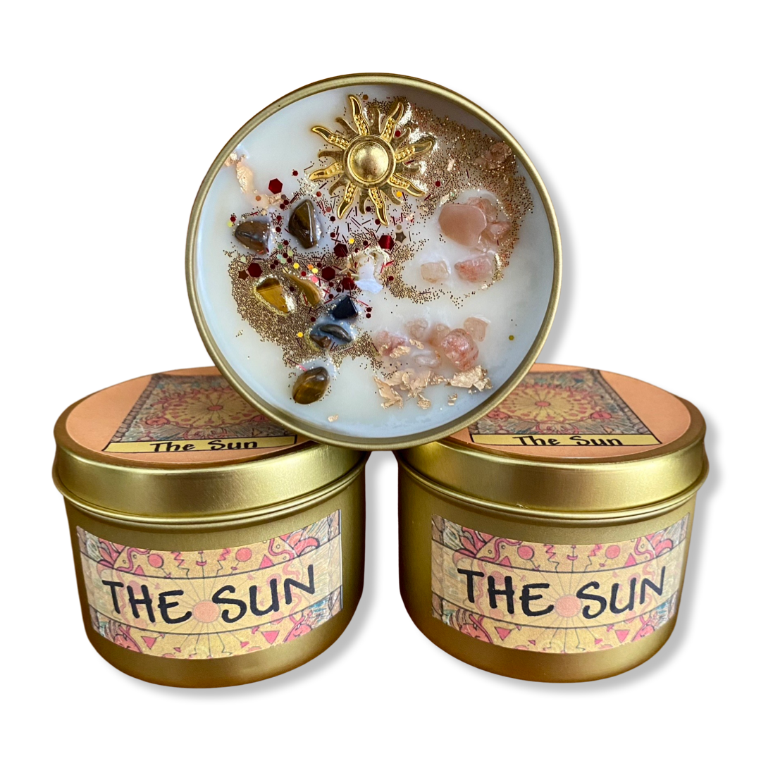 Sun, eclipse, soy candle, crystals, small batch, soy wax, tin candle, spiritual, spa, yoga, manifestation, abundance, Tarot, subscription box, summer, spring
