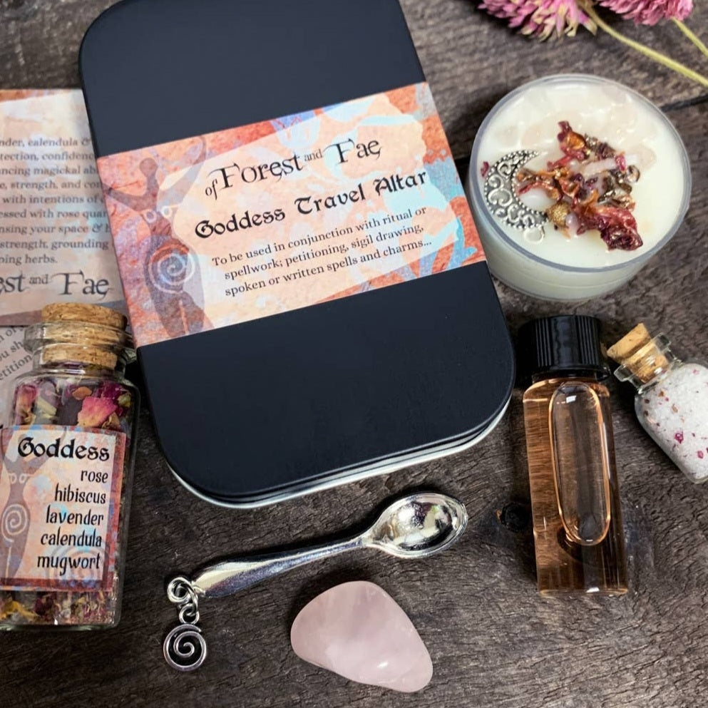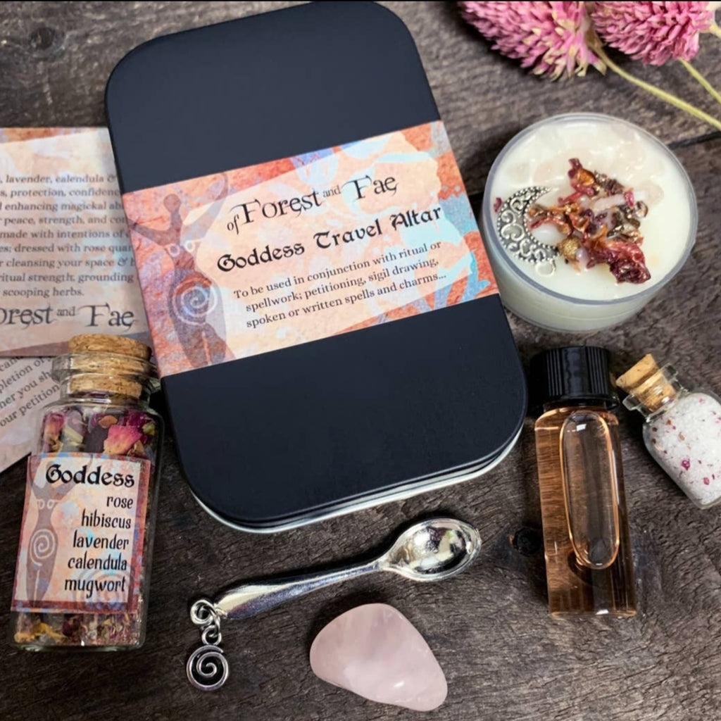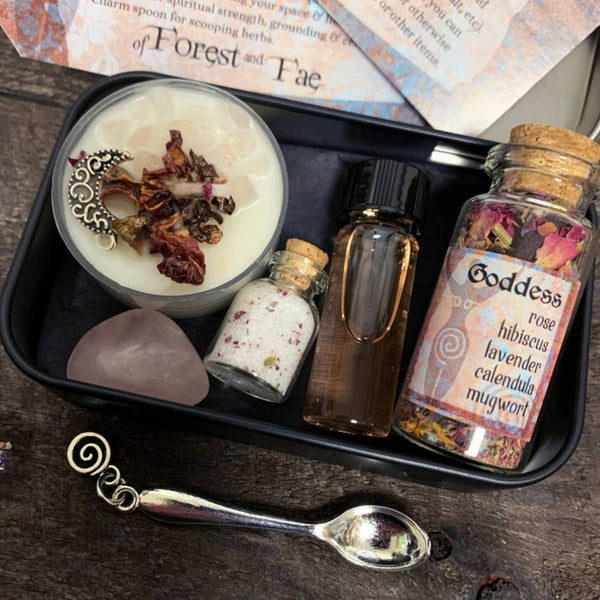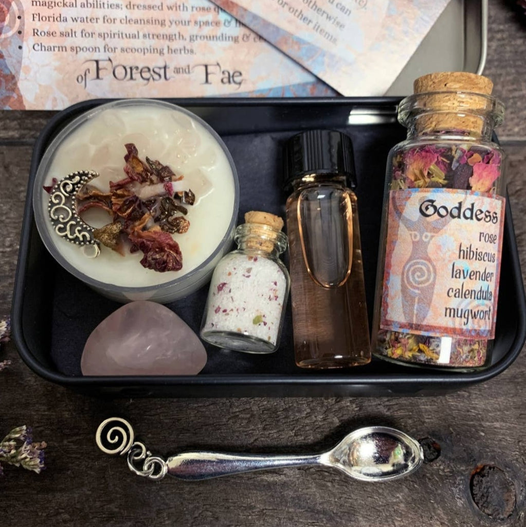 Bring the magic to your home with this Goddess miniature altar kit! This all-in-one package includes rose quartz, a candle, herbs, salt, Florida water, and a small spoon to help make your practice complete. A perfect gift for anyone looking to bring a little bit of mystery and power into their lives!