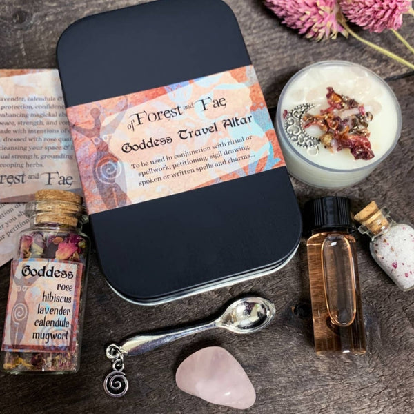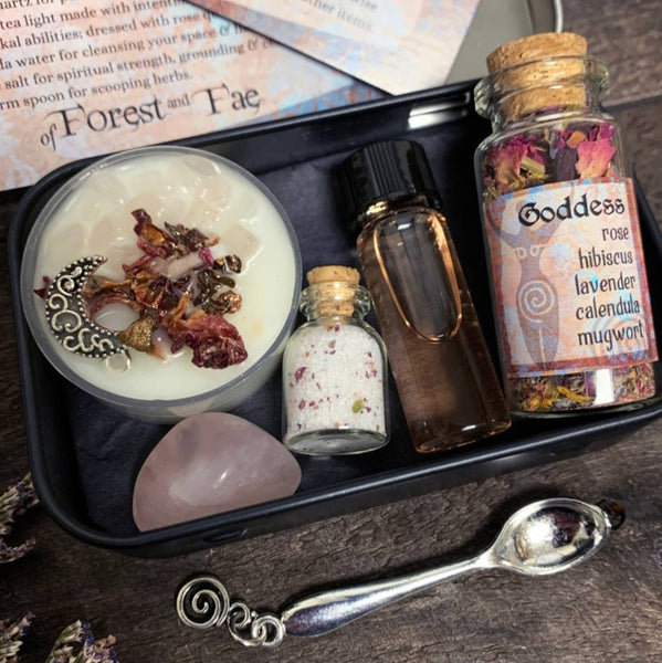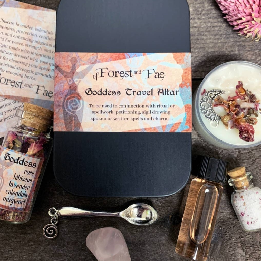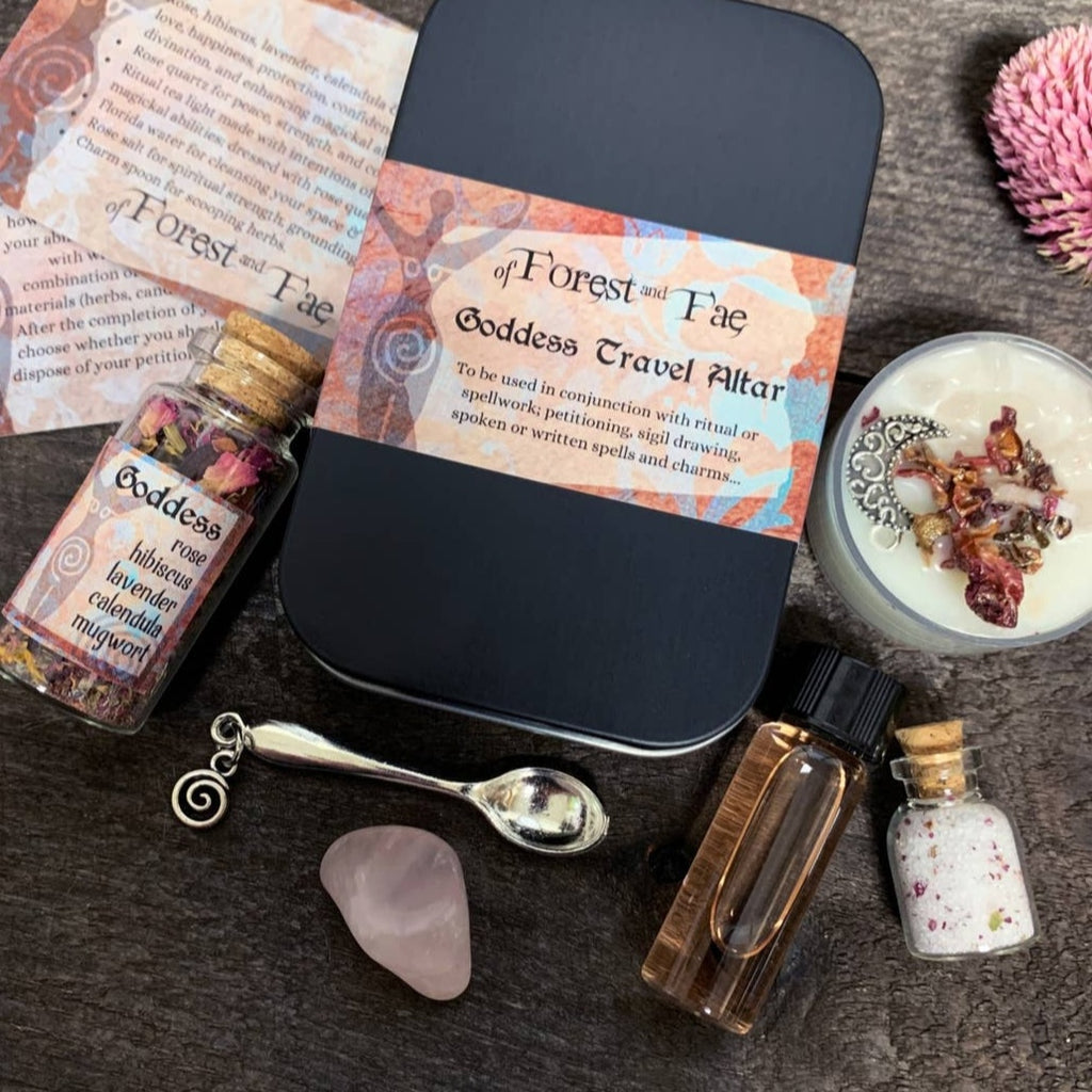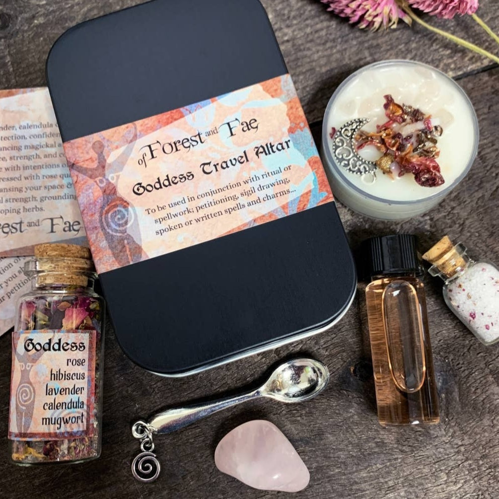 Bring the magic to your home with this Goddess miniature altar kit! This all-in-one package includes rose quartz, a candle, herbs, salt, Florida water, and a small spoon to help make your practice complete. A perfect gift for anyone looking to bring a little bit of mystery and power into their lives!