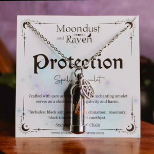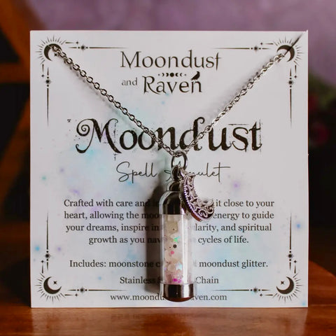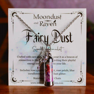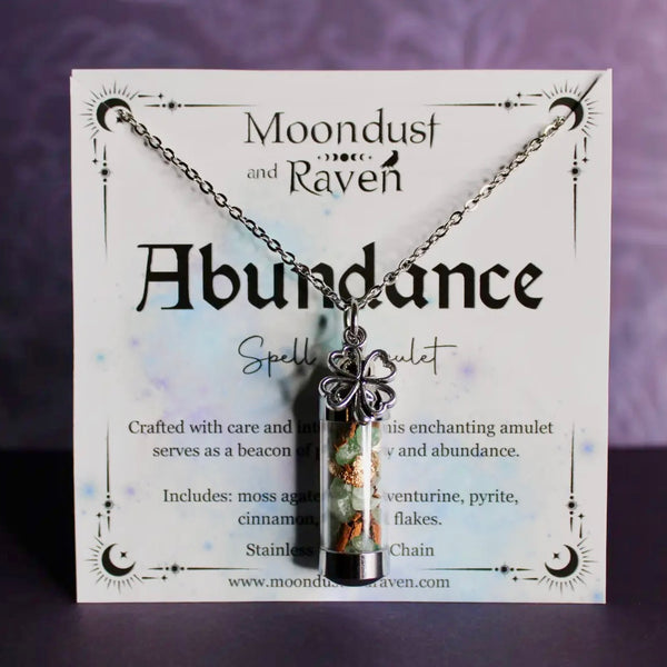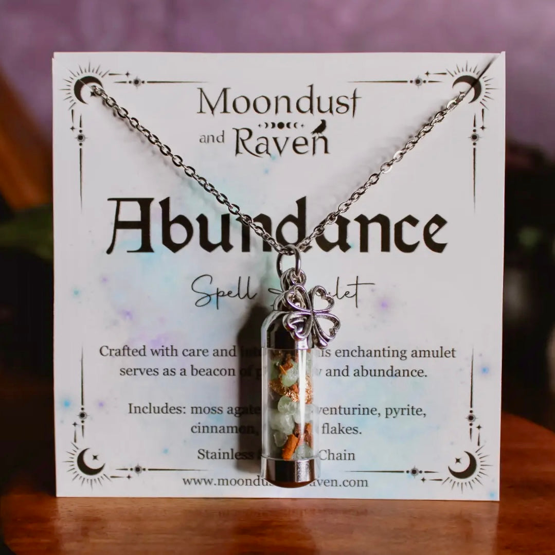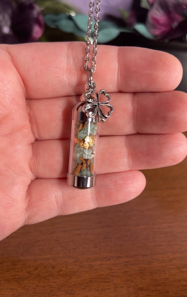 Our Abundance Spell Jar Amulet Necklace contains a powerful blend of moss agate, green aventurine, pyrite, cinnamon, and gold flakes, each chosen for their abundance properties. It is accompanied by a silver clover charm.