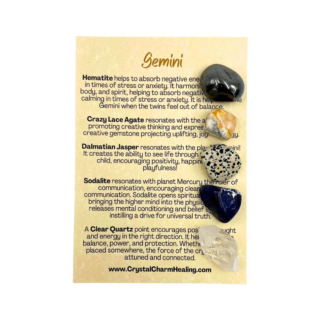 Gemini Zodiac Crystal Set | 5/20 – 6/21 | Astrology Stones Box Set & Information | Hematite, Crazy Lace Agate, Dalmatian Jasper, Sodalite, & Clear Quartz Point