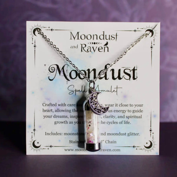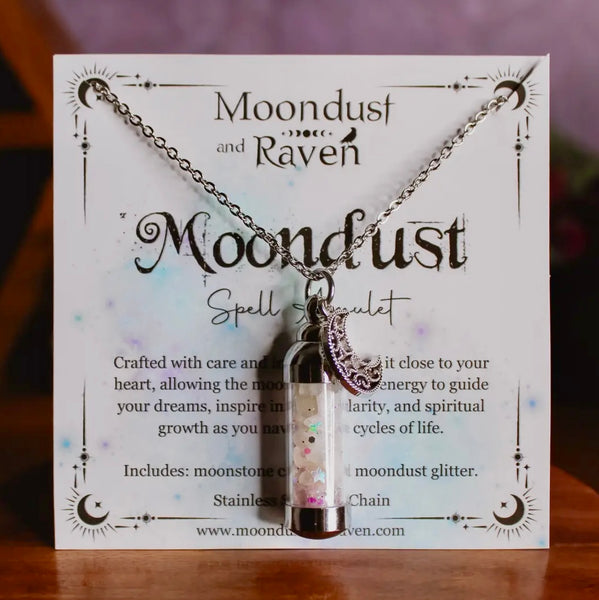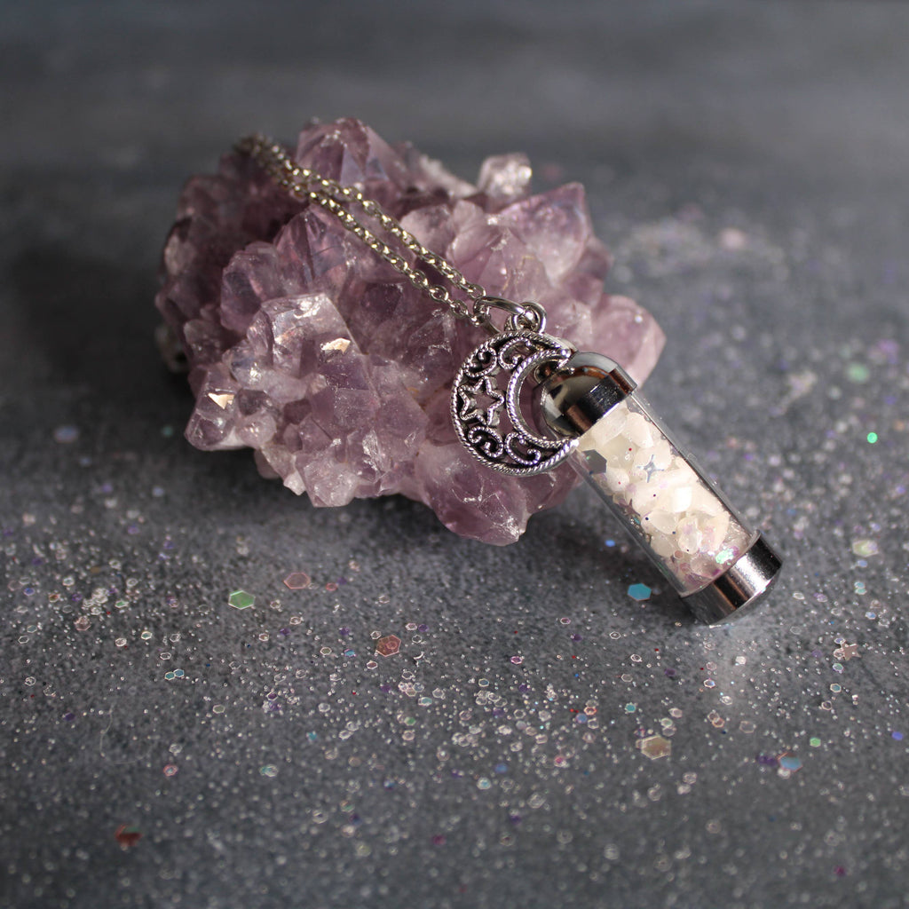 Our Moondust Spell Jar Amulet Necklace contains moonstone crystal chips, and moondust glitter.