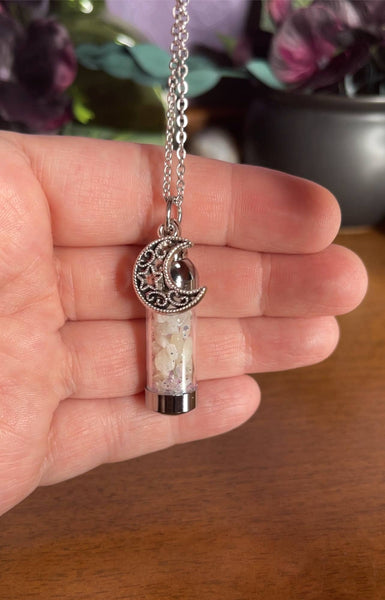 Moondust Spell Jar Amulet Necklace | Witchy Crystal Jewelry | Moonstone Crystal Chips, and Moondust Glitter.