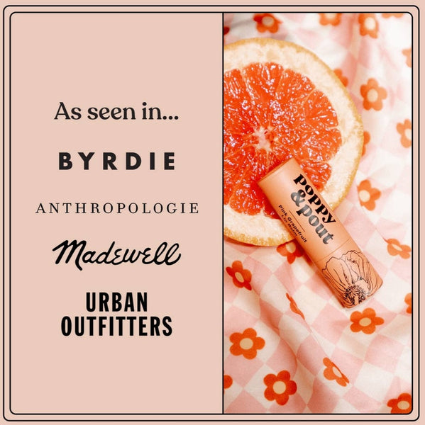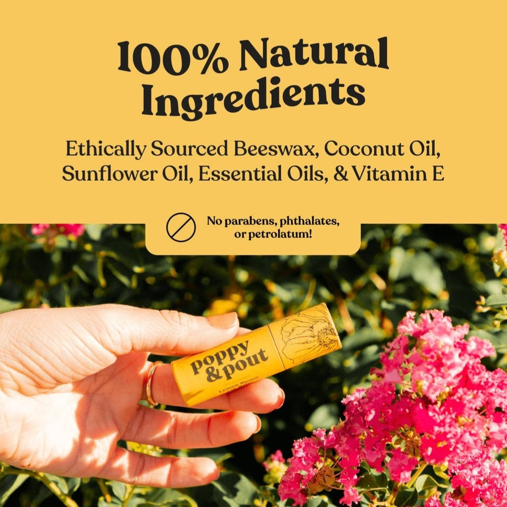 🌼 about Poppy & Pout We have been making our all-natural lip care products by hand in Idaho since 2014. Our lip balms are made from ethically sourced beeswax, organic coconut oil, and sunflower oil. We then add a hint of essential oils and/or natural flavor oils and a drop of vitamin E. That's it! Simple ingredients for perfectly hydrated lips.